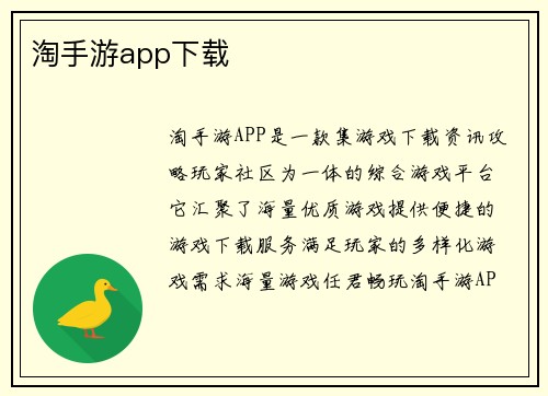 淘手游APP是一款集游戏下载、资讯攻略、玩家社区为一体的综合游戏平台。它汇聚了海量优质游戏,提供便捷的游戏下载服务,满足玩家的多样化游戏需求。
